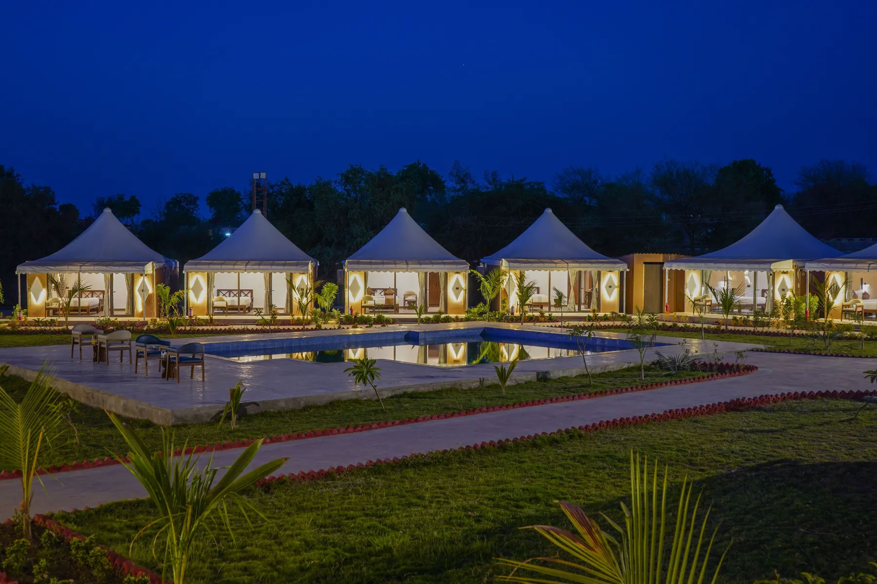 Recreation: Amenities include a swimming pool, gardens, and curated activities like light treks, cycling, and campfires.