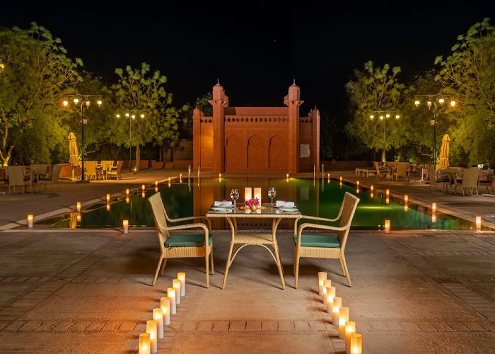 Design: Reflects Rajasthani heritage with intricate jharokhas, Usta art (camel bone/wood with 24k gold ink), and traditional courtyard designs.